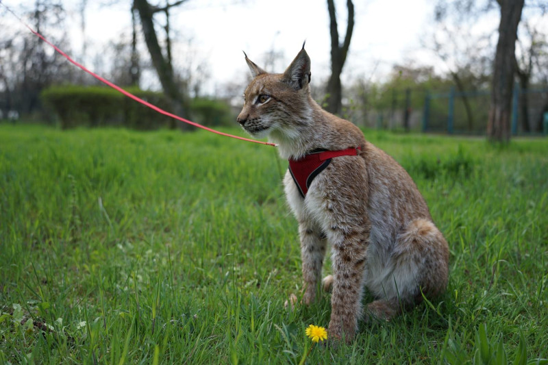 Рись Марися сидить на траві під час вигулу. Суспільне Миколаїв/Олександр Гордієнко