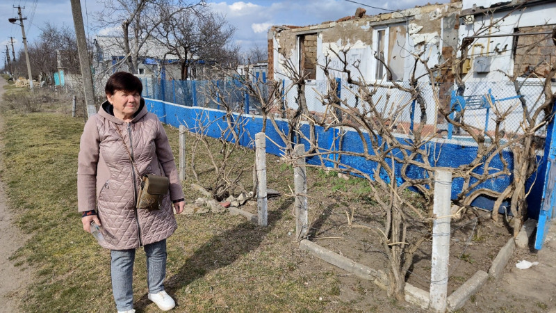 Місцева жителька Тетяна Шкопура поруч із пошкодженим будинком у Квітневому. Суспільне Миколаїв/Федір Бондар