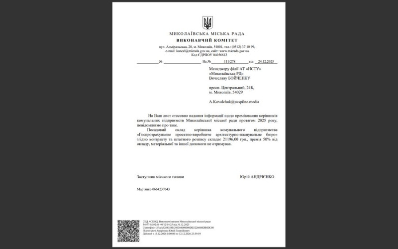 Виконавчі органи Миколаївської міської ради надали відповіді на інформаційний запит Суспільного щодо посадових окладів і премій керівників комунальних підприємств та установ у 2025 році.