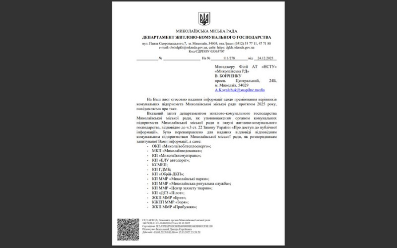 Відповідь департаменту ЖКГ міськради на запит Суспільного. Суспільне Миколаїв
