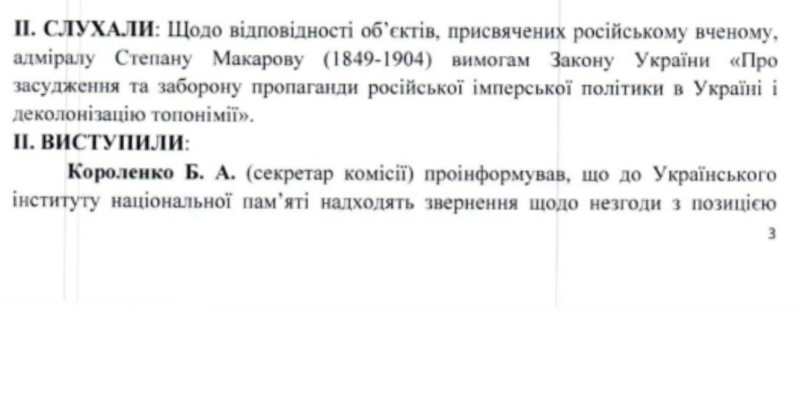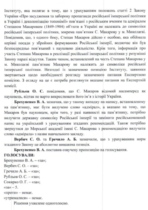 "Враховуючи, все сказане вище, незрозумілим є Експертний висновок Українського інституту національної пам’яті від 24.09.2025 р. про неналежність об’єктів, пов’язаних із С. Макаровим, до символіки російської імперської політики."Топонімічна комісія Миколаєва дала чітку позицію, щодо С. Макарова, перейменувавши вулицю Адмірала Макарова на гетьмана Павла Скоропадського (у 2024 році в Миколаєві були перейменовані дві вулиці Макарова. Вони отримали назви вул. Павла Скоропадського та вул. Яхтова — ред.). На черзі, сподіваюся, перейменування Національного університету кораблебудування. Макаров є типовим символом колишньої російської імперської епохи", — сказав Юрій Котляр.