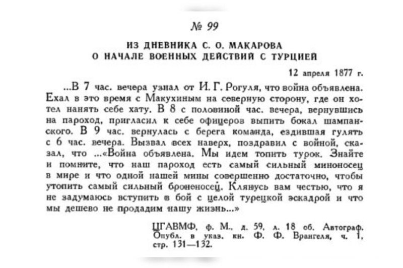 Запис в щоденнику С.Макарова про початок війни з Туреччиною. Щоденник Степана Макарова