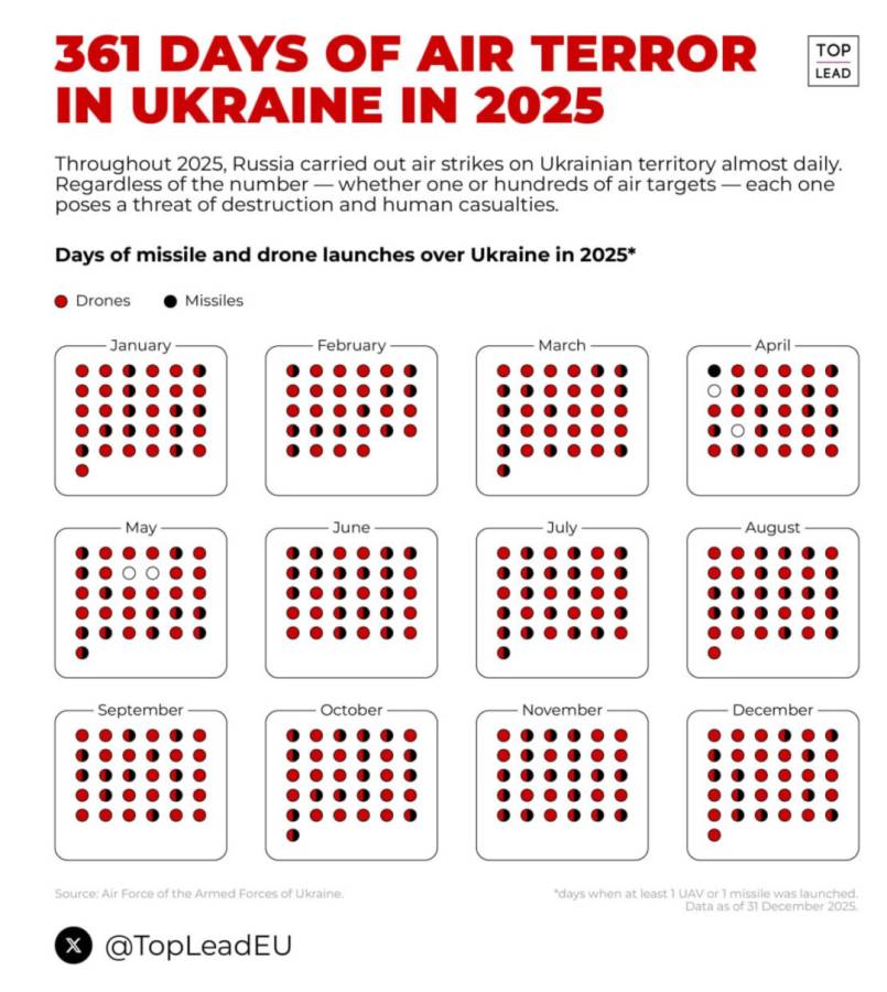 «Для всіх, хто сумнівається — календар російських бомбардувань України: 361 із 365 днів!», — зазначила Матернова, побажавши Україні миру в 2026 році.