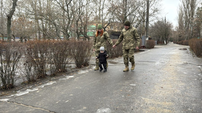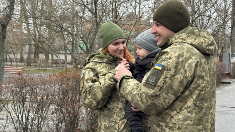 Військовослужбовиці Гана та Максим обіймають сина. Суспільне Миколаїв/Валентина Гурова