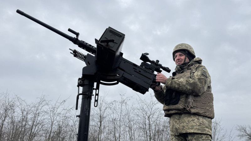 Військовослужбовець стоїть біля великокаліберного кулемета. Суспільне Миколаїв/Юлія Філімон