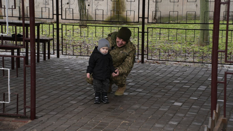 Військовослужбовець Максим посміхається поруч з сином. Суспільне Миколаїв/Юлія Філімон