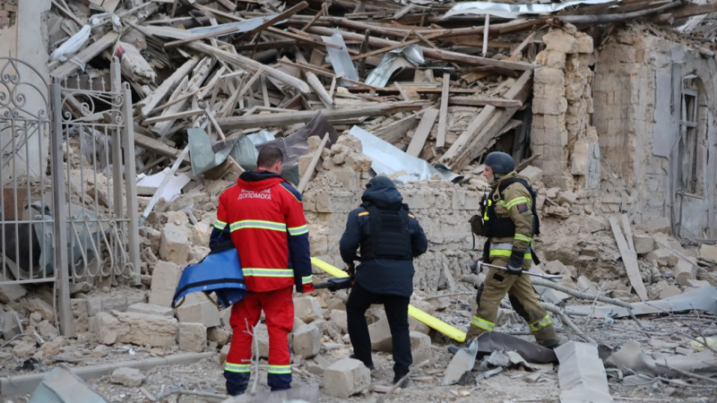 Працівники екстрених служб перед будинком у Херсоні, який зруйнував російський снаряд, лютий 2025 року Суспільне Херсон/Олександр Корняков