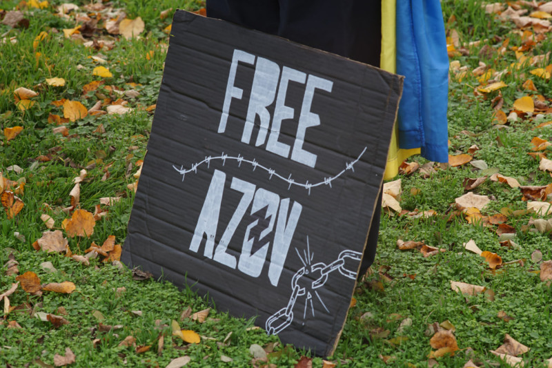 Люди стоять із власноруч намальованими плакатами та стягами зі світлинами українських захисників.