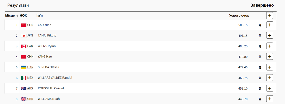 Результати кваліфікаційних стрибках у воду. Скриншот Миколаївські спортсмени в Олімпіаді-2024