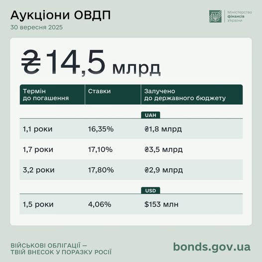 Міністерство фінансів України 30 вересня 2025 року на аукціоні з розміщення облігацій внутрішньої державної позики (ОВДП) залучило до державного бюджету ₴14,5 мільярда в еквіваленті.
