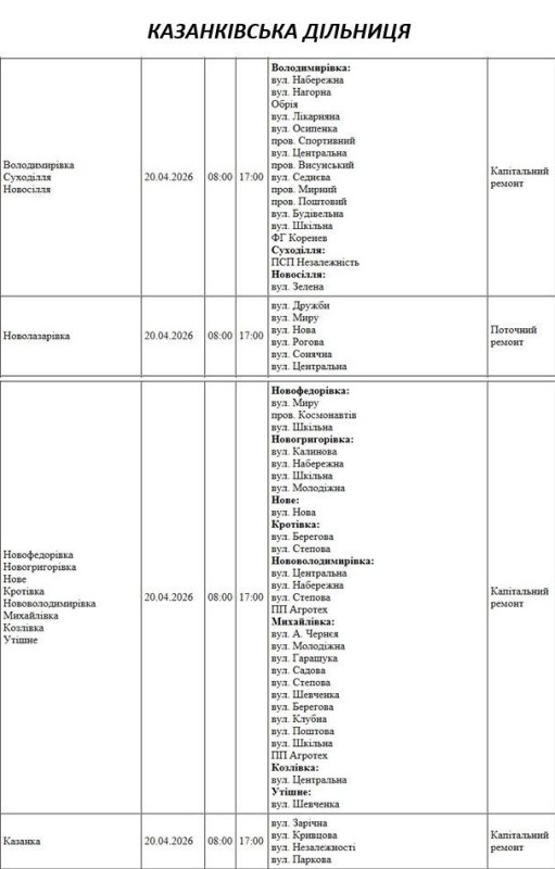 Графік відключення світла по адресах 20 квітня, Казанківська дільниця АТ «Миколаївобленерго»