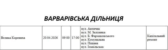 Графік відключення світла по адресах 20 квітня, Варварівська дільниця АТ «Миколаївобленерго»