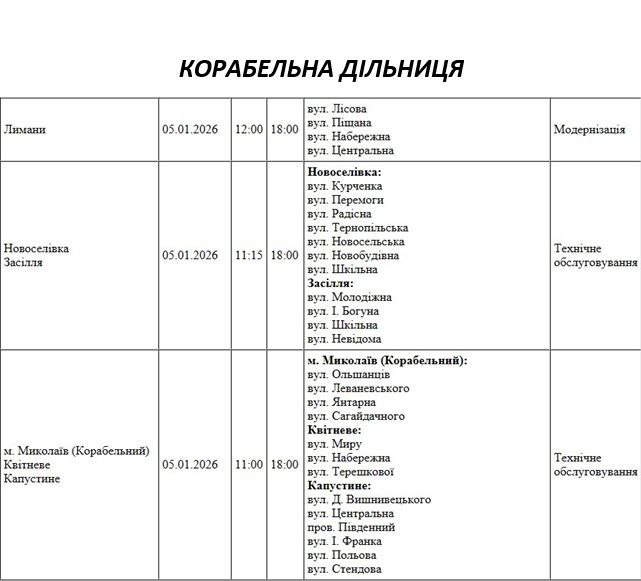 На Миколаївщині 5 січня деякі вулиці залишаться без електропостачання. Це пов'язано із поточними ремонтними роботами, реконструкціями та технічним обслуговуванням.