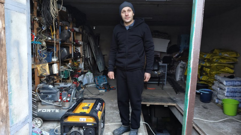 Місцевий житель Білозірки Андрій Картель із генератором у гаражі. Суспільне Миколаїв/Федір Бондар
