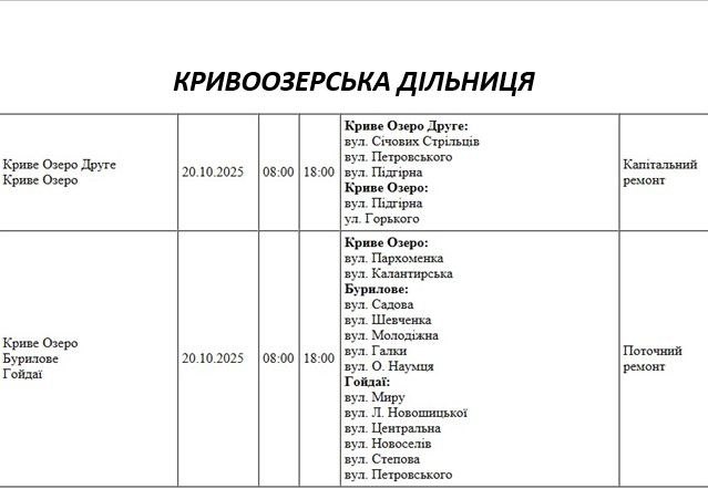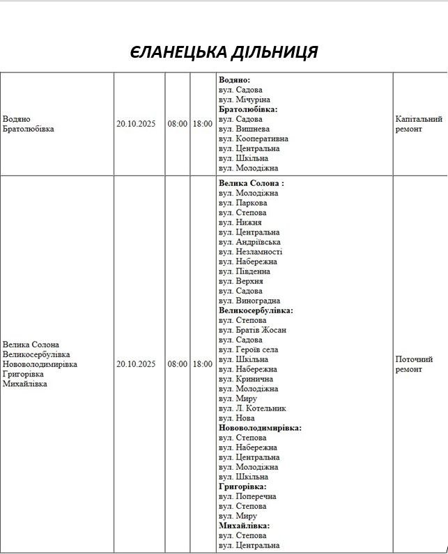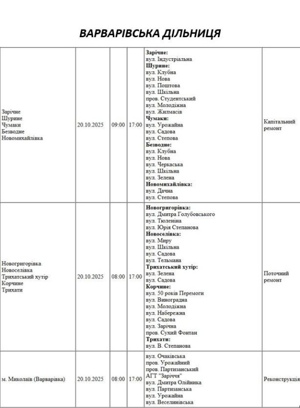 Графік відключення світла по адресах на 20 жовтня, Варварівська дільниця АТ «Миколаївобленерго»