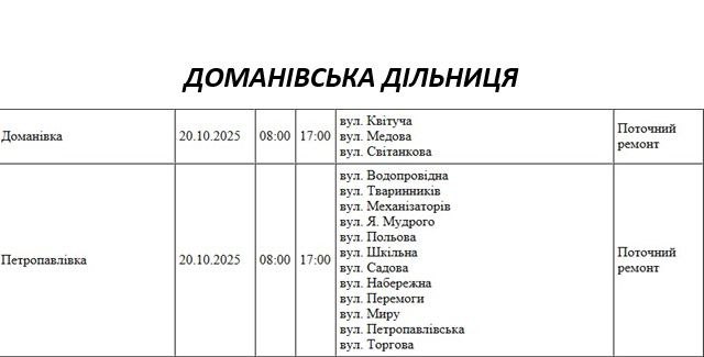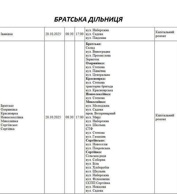 Графік відключення світла по адресах на 20 жовтня, Братська дільниця АТ «Миколаївобленерго»