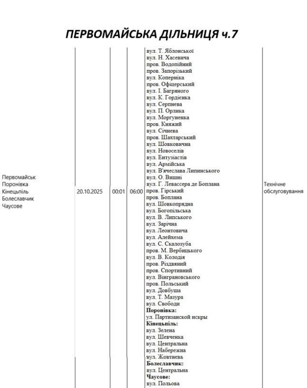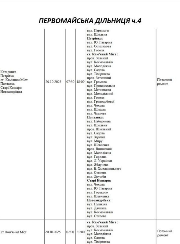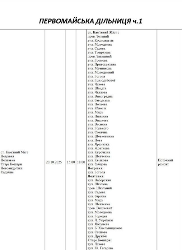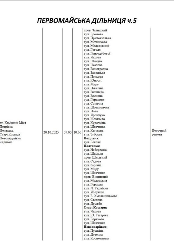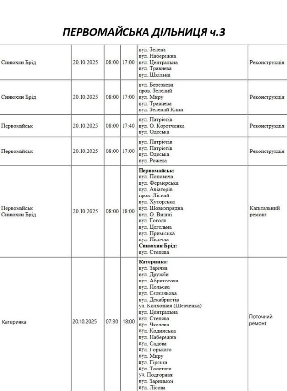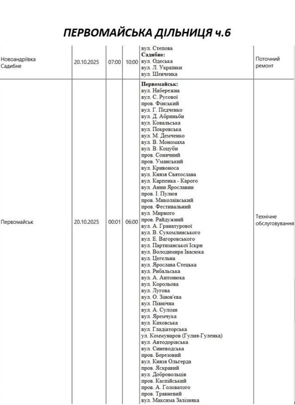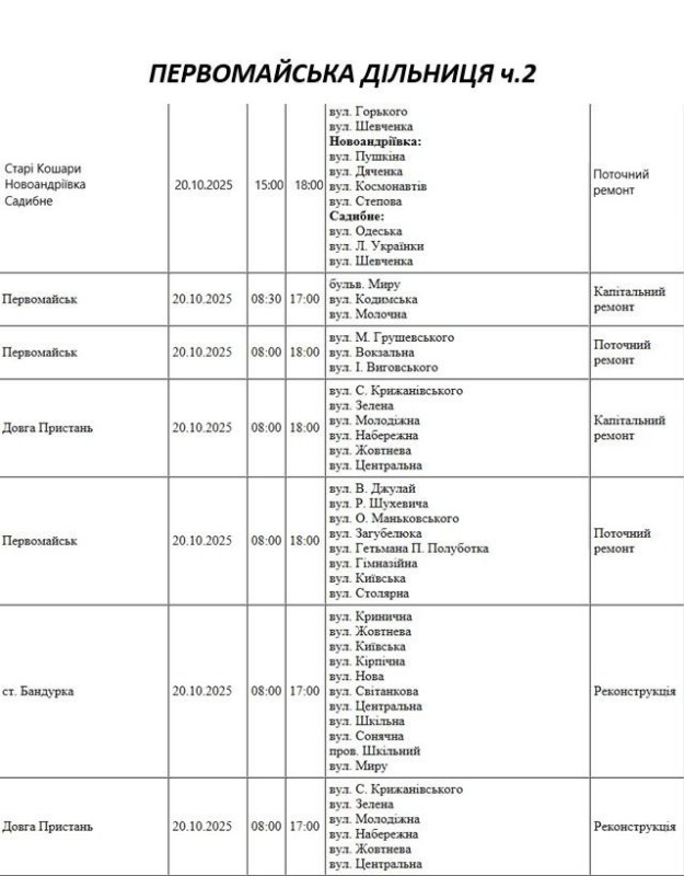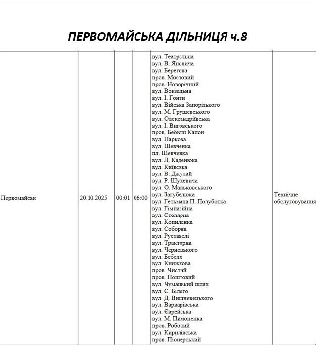 Графік відключення світла по адресах на 20 жовтня, Первомайська дільниця АТ «Миколаївобленерго»