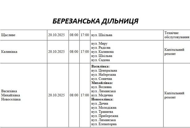 Графік відключення світла по адресах на 7 жовтня, Березанська дільниця АТ «Миколаївобленерго»