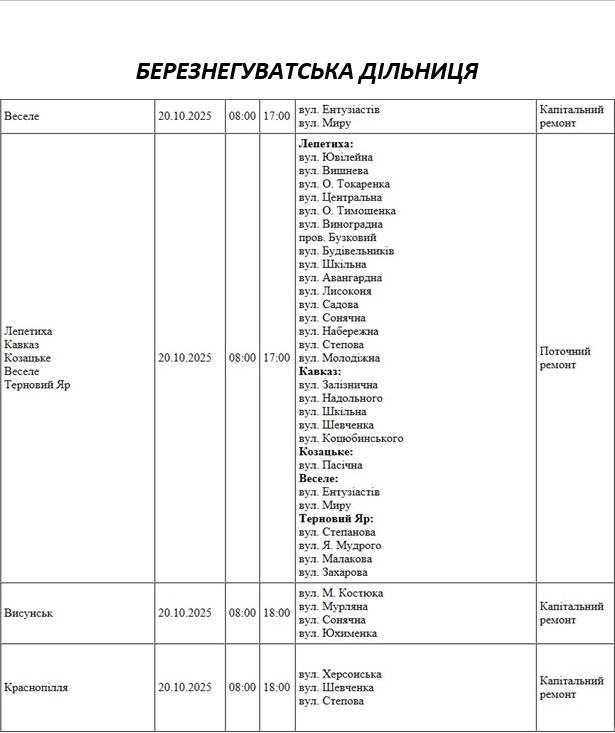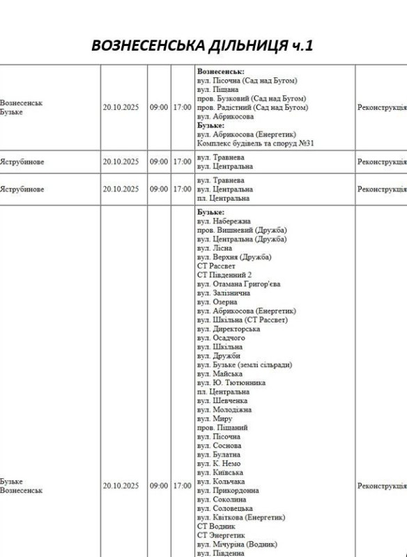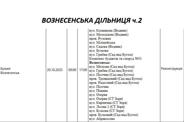 Графік відключення світла по адресах на 20 жовтня, Вознесенська дільниця АТ «Миколаївобленерго»
