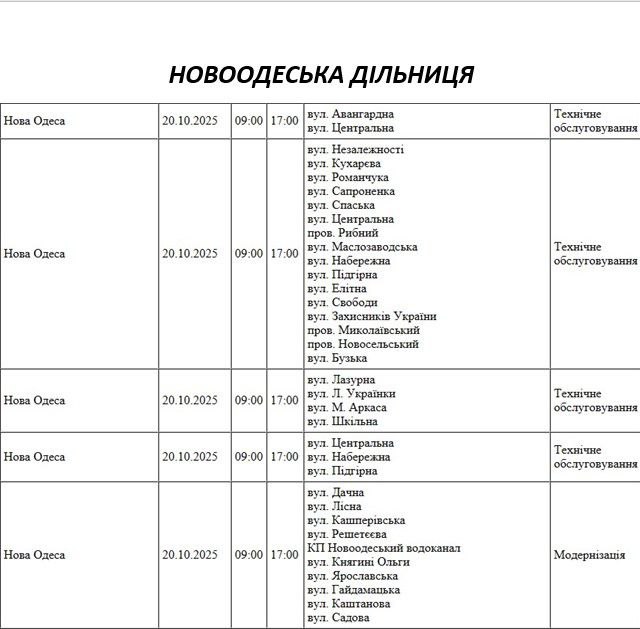 Графік відключення світла по адресах на 7 жовтня, Новоодеська дільниця АТ «Миколаївобленерго»