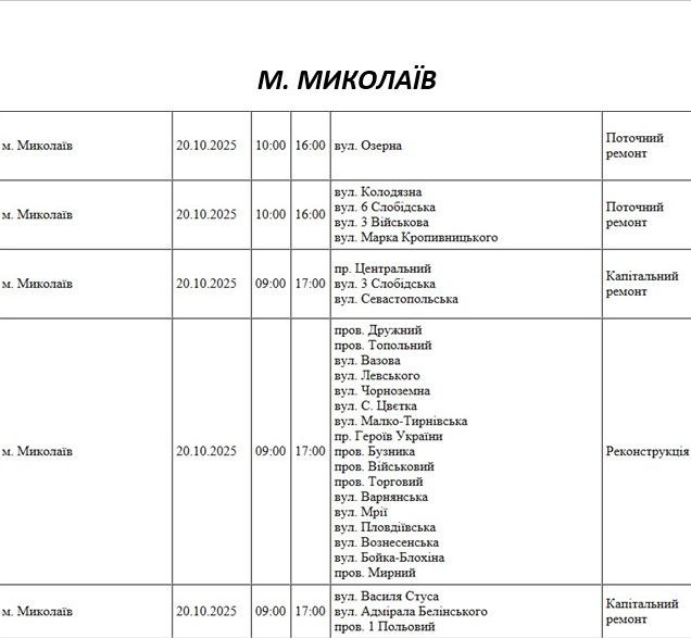 Графік відключення світла по адресах на 20 жовтня, Миколаївська дільниця АТ «Миколаївобленерго»