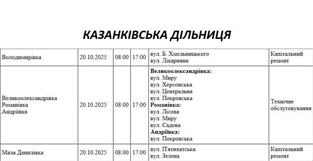 Графік відключення світла по адресах на 7 жовтня, Казанківська дільниця АТ «Миколаївобленерго»