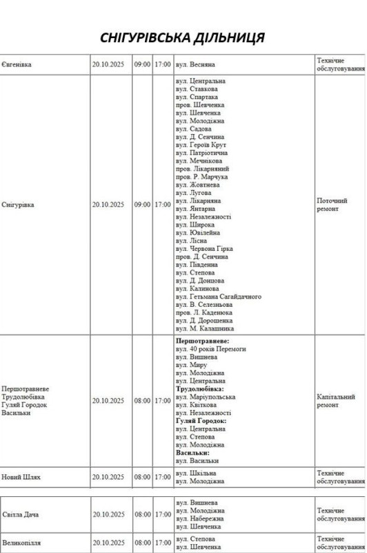 Графік відключення світла по адресах на 7 жовтня, Снігурівська дільниця АТ «Миколаївобленерго»
