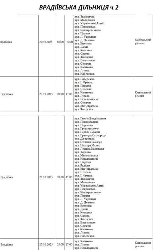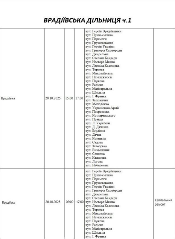 Графік відключення світла по адресах на 20 жовтня, Врадіївська дільниця АТ «Миколаївобленерго»