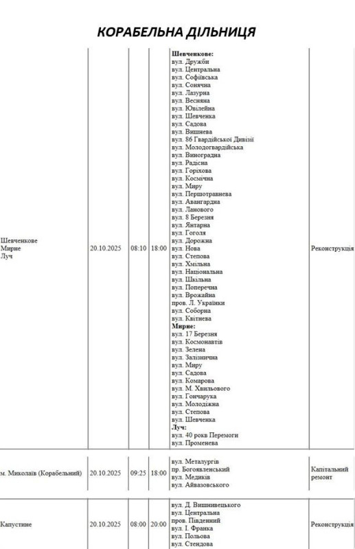 Графік відключення світла по адресах на 20 жовтня, Корабельна дільниця АТ «Миколаївобленерго»