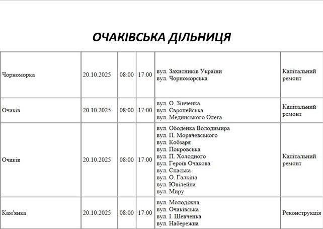 Графік відключення світла по адресах на 7 жовтня, Очаківська дільниця АТ «Миколаївобленерго»