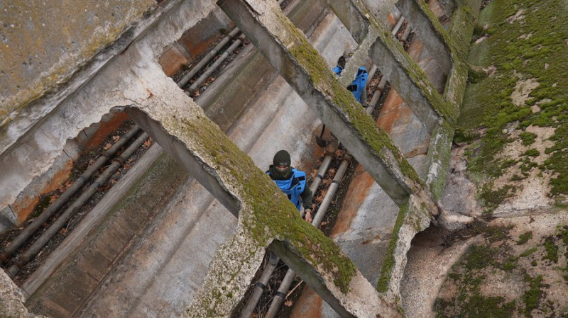 "Територія цих споруд — це два великі басейни, розміром 48 на 48 метрів. Частина з них з водою, а частина — суха та вже не використовується", — говорить командир саперного підрозділу.