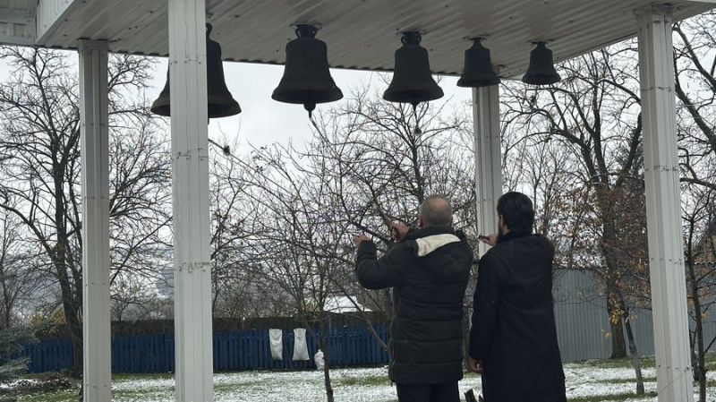 Священнослужителі біля дзвіниці храму в селі Сирове. Суспільне Миколаїв/Назарій Рубаняк