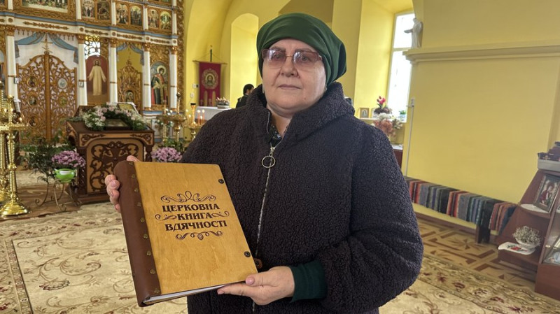 Староста храму Ірина Парсенюк тримає книгу вдячності. Суспільне Миколаїв/Назарій Рубаняк