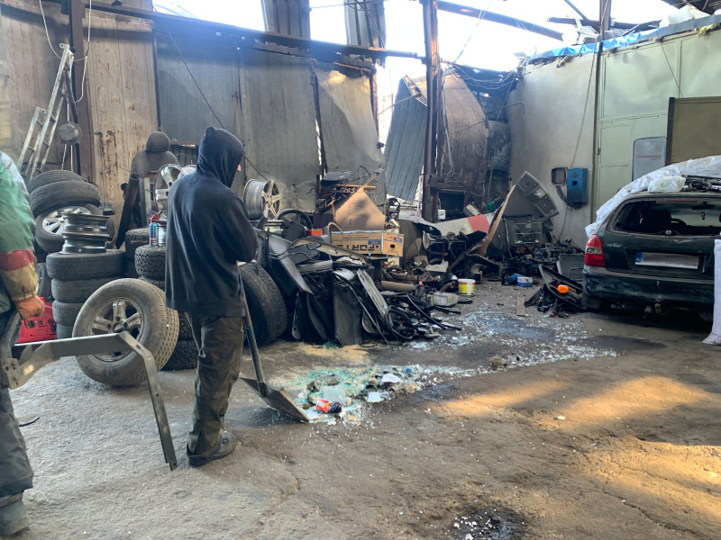 Чоловік оглядає пошкодження всередині СТО після атаки. Миколаїв, 3 листопада 2025 року Богдана Будулуца/Суспільне Миколаїв