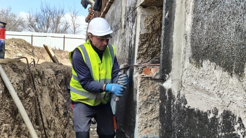 "Будуємо для дітей бомбосховище протирадіаційного типу для того, щоб дітки могли нормально вчитися офлайн. У мене шість людей — разом зі мною і ще є підрядник, який займається основною роботою. Ми, так би мовити, допомагаємо: докладаємо цеглу, замазуємо шви, мажемо стіну — це гідроізоляція", — каже він.