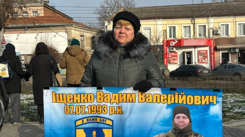 Переселенка з Херсона Любов прийшла разом з чоловіком на акцію-нагадування про полонених та безвісти зниклих військових аби нагадати про свого сина. Він зник влітку 2025.