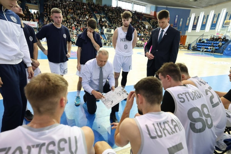 Головний тренер «Ніко-баскету» Валентин Берестнєв разом з командою під час перерви у матчі проти «Черкаських Мавп». Федерація баскетболу України