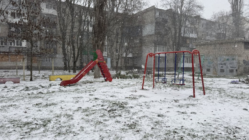 Сніг падає на дитячий майданчик в Миколаєві, 26 грудня 2025 рік. Суспільне Миколаїв/Валентина Гурова