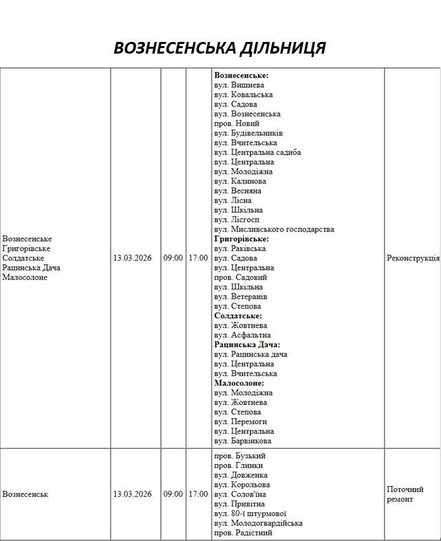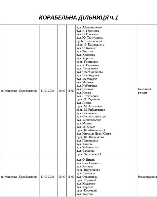 На Миколаївщині 13 березня деякі вулиці залишаться без електропостачання. Це пов'язано із поточними ремонтними роботами, реконструкціями та технічним обслуговуванням. Також діятимуть погодинні відключення електроенергії з 17:00 до 22:00.