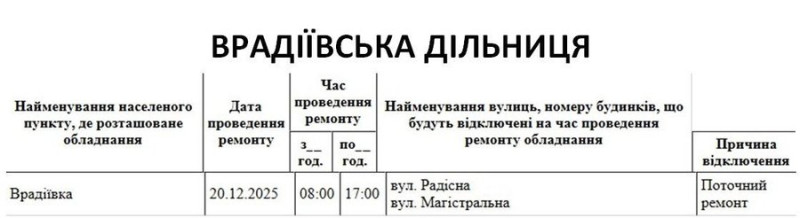 Графік відключення світла по адресах 20 грудня, Врадіївська дільниця. АТ «Миколаївобленерго»
