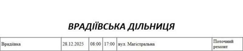 Графік відключення світла по адресах 28 грудня, Врадіївська дільниця. АТ «Миколаївобленерго»