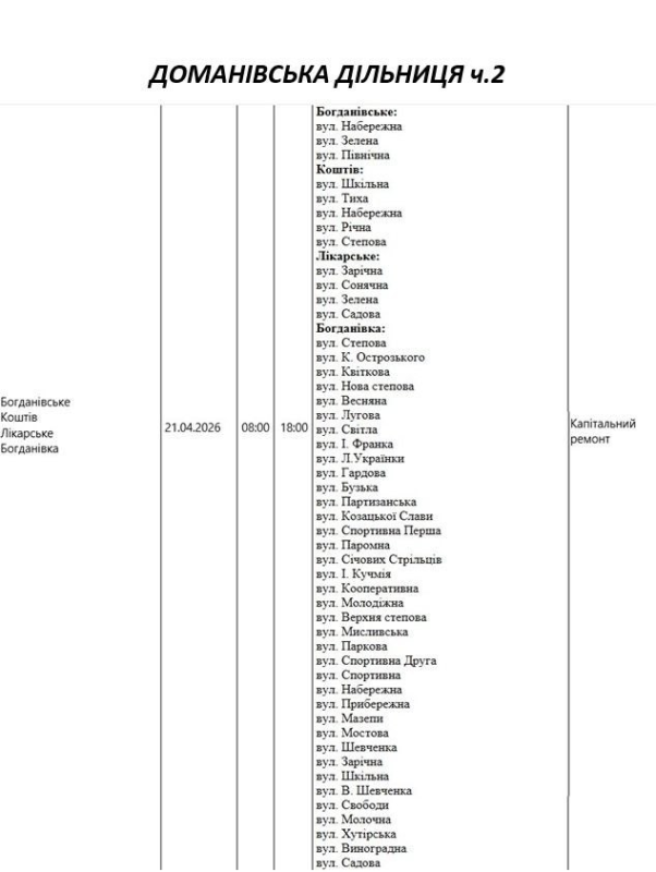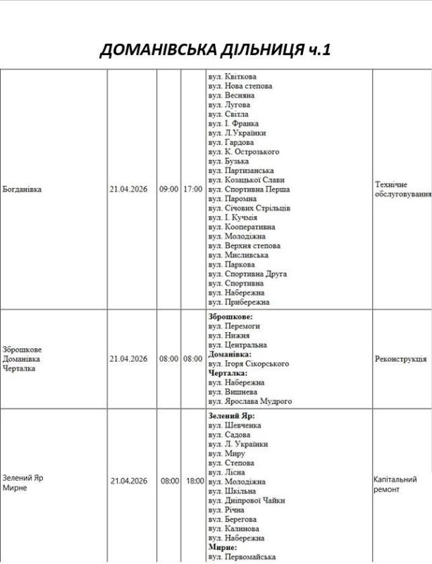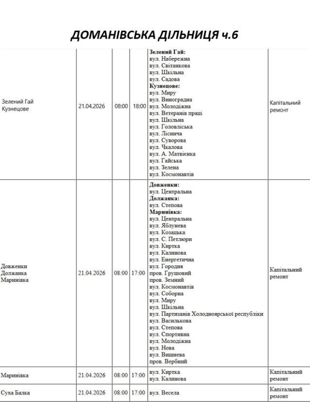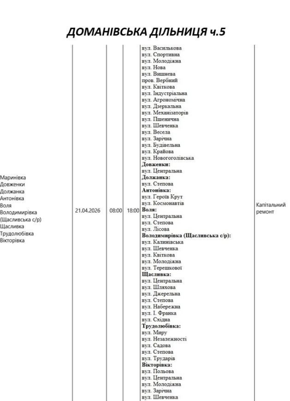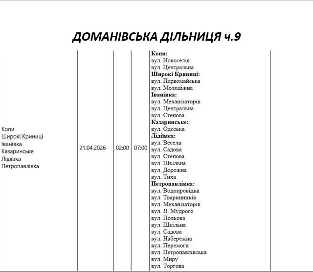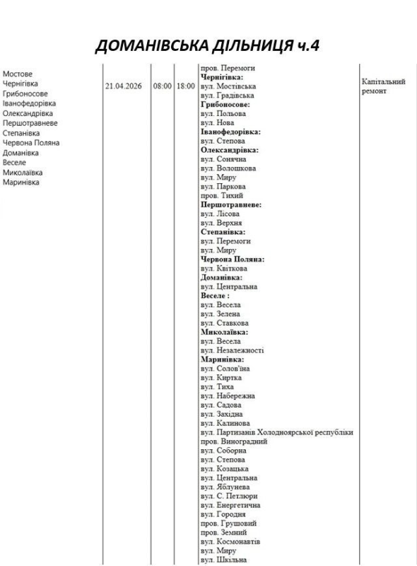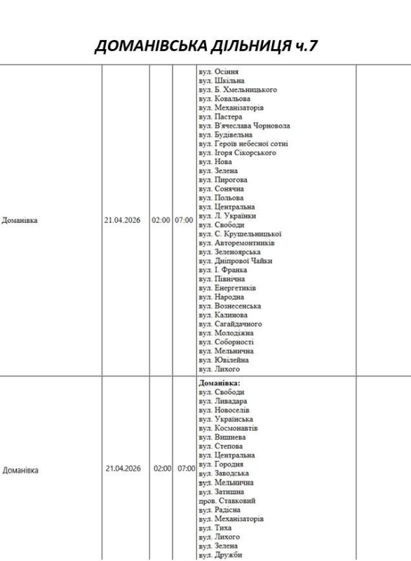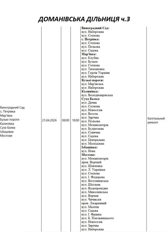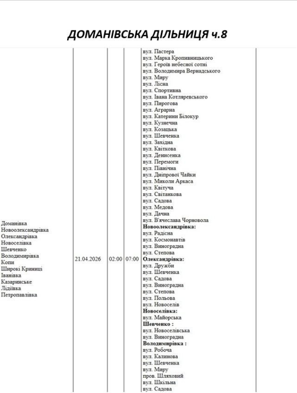Графік відключення світла по адресах 21 квітня, Доманівська дільниця. АТ «Миколаївобленерго»