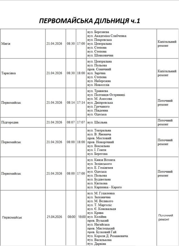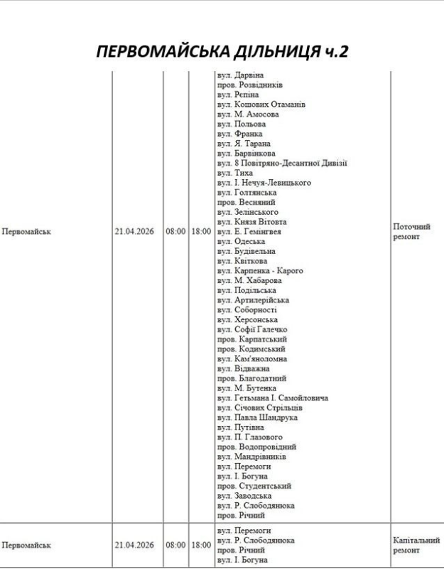 Графік відключення світла по адресах 21 квітня, Первомайська дільниця. АТ «Миколаївобленерго»