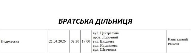 Графік відключення світла по адресах 21 квітня, Братська дільниця. АТ «Миколаївобленерго»