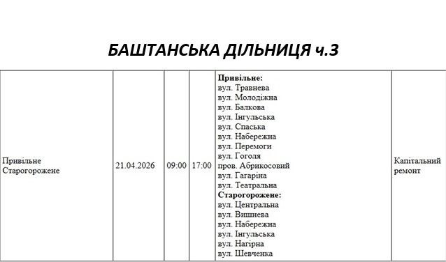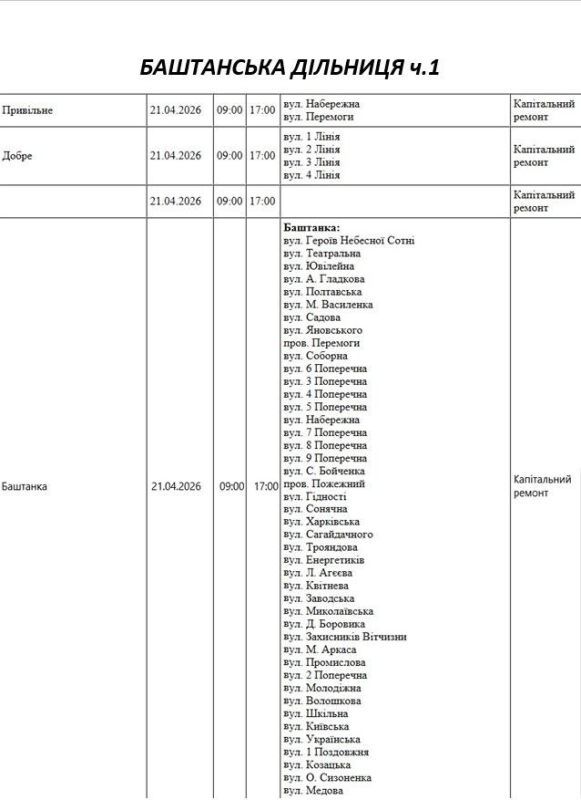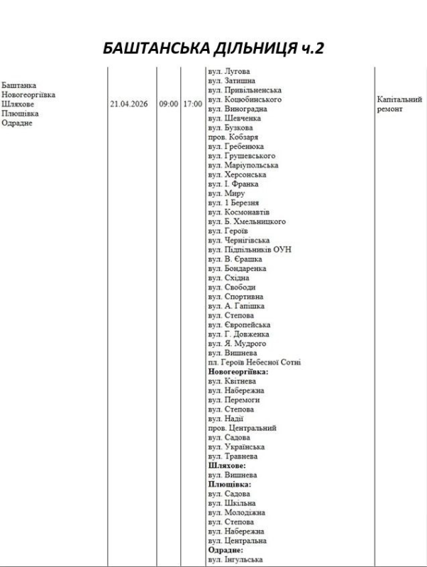 Графік відключення світла по адресах 21 квітня, Баштанська дільниця. АТ «Миколаївобленерго»