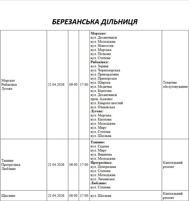 Графік відключення світла по адресах 21 квітня, Березанська дільниця. АТ «Миколаївобленерго»