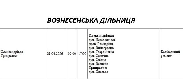 Графік відключення світла по адресах 21 квітня, Вознесенська дільниця. АТ «Миколаївобленерго»