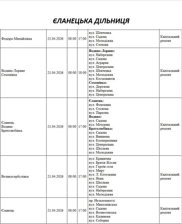 Графік відключення світла по адресах 21 квітня, Єланецька дільниця. АТ «Миколаївобленерго»