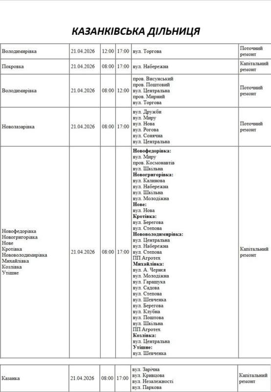 Графік відключення світла по адресах 21 квітня, Казанківська дільниця. АТ «Миколаївобленерго»