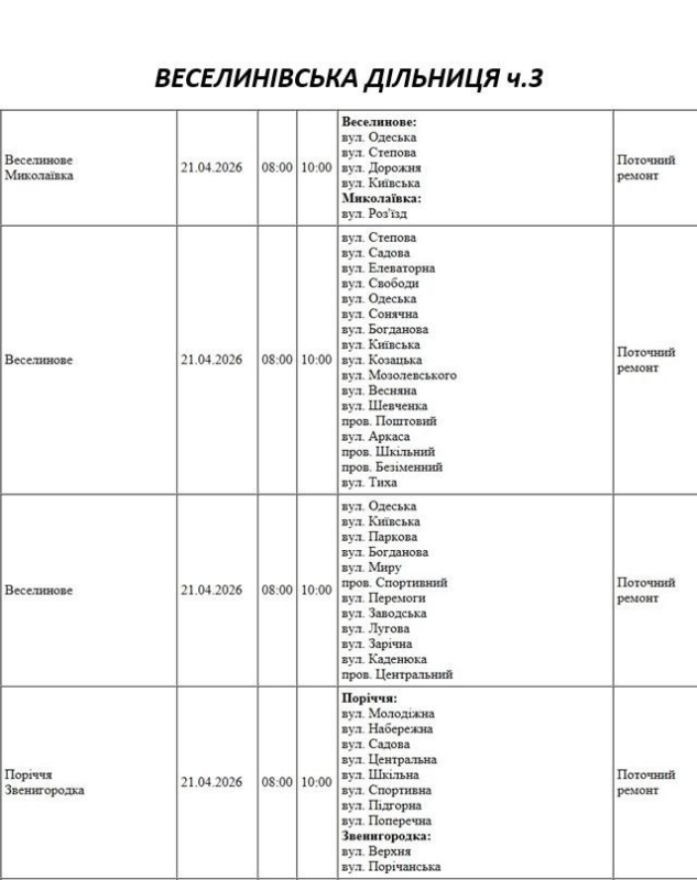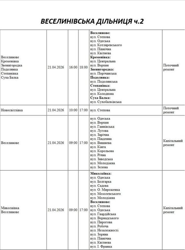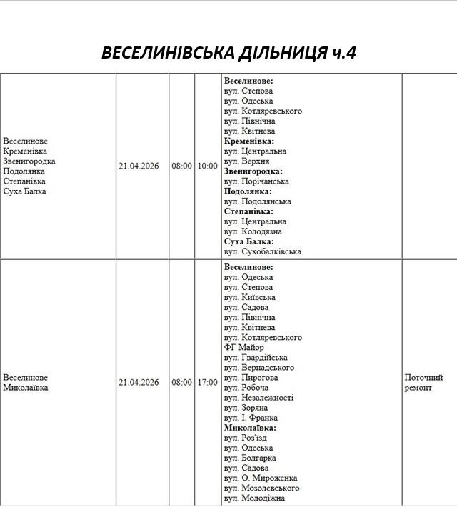 Графік відключення світла по адресах 21 квітня, Веселинівська дільниця. АТ «Миколаївобленерго»